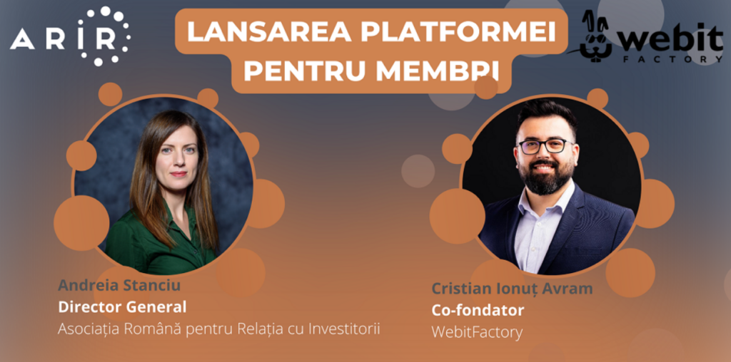 Andreia Stanciu, Director General ARIR: „Noua platformă dedicată membrilor este încă un pas înspre creșterea nivelului de interacțiune în cadrul ARIR, o comunitate activă de emitenți listați la Bursa de Valori București. Pentru că profesioniștii în relația cu investitorii trebuie să fie mereu conectați la tendințe și adoptarea de noi tehnologii, ne bucurăm să îi susținem din nou prin implementarea unui proiect inovator utilizând de această dată inteligența artificială, după ce în urmă cu câțiva ani am utilizat tehnologia blockchain. Le mulțumim partenerilor noștri de la WebitFactory pentru procesul de dezvoltare care s-a desfășurat excelent și suntem convinși că rezultatul la care am ajuns împreună este un începutul unei direcții de dezvoltare tot mai consistentă în cadrul organizației. ”