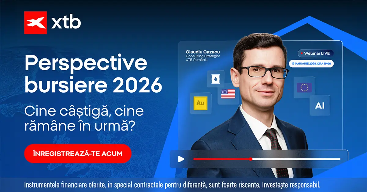 XTB vă invită să participați la WEBINARUL ONLINE cu Claudiu Cazacu, unul dintre cei mai respectați analiști ai piețelor financiare, pentru a descoperi ce ar putea aduce anul 2026 pentru economia globală și pentru investițiile tale.